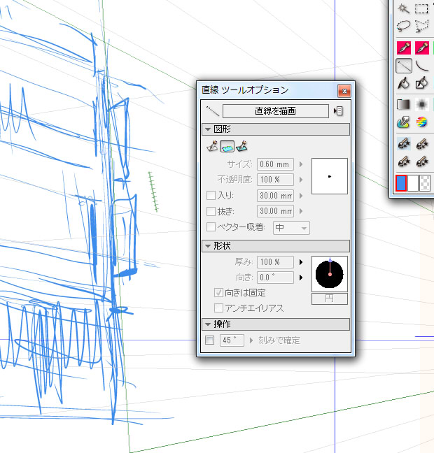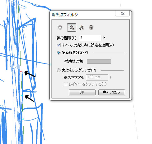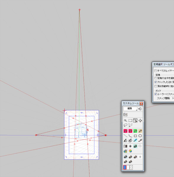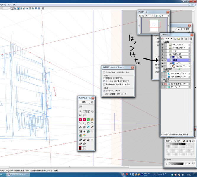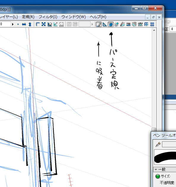 大体において「風景」レイヤーにパース定規を置いてもらうのですが