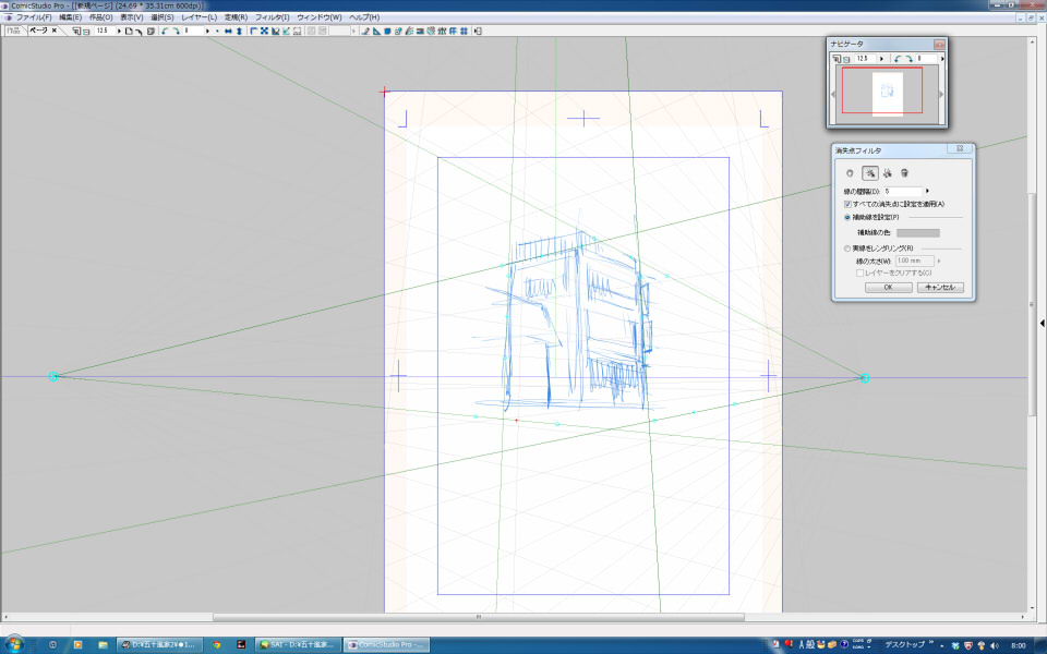 まず「天井」のパース点を置いてください。 天井パースからおく理由は後述します。 こんな感じでまず適当に置いてください。 ④ パースの方向を決めていきます。 それぞれのパース線に「○」と「+」があると思います。 この「+」が線の軸で、 「○」をドラッグすることでパース調整をします。 「+」の軸を任意の場所に配置した後 「○」でパース角度を調節します。 「天井」パース点は原稿からはみ出てしまうことがままあります。ていうかほとんど。 ⑤ 同様に、「右」のパース点と「左」のパース点を置き、 それぞれパースを調節します。 そーすると、アイレベル(平行線)が青の色で、 垂直線が緑の線で現れます。 なんでかこの順番でないとアイレベルが平行にきません。 このアイレベルと垂直線が自然に感じる所まで 調節してください。 目安としては、コマ横線とアイレベルが平行な場合 「左右パース」は「建物の上てっぺん」と「キャラクターの目線」にあわせる、 「天井パース」は「画面の真ん中をぶった切る」ように置く、と おおざっぱに覚えておいてください。 僕のアタリ線が適当過ぎてどこが一番いい場所か分からない なんてこともあると思いますが、目立つパース線がここにあると空間が把握しやすい という場所があるので、それを意識しながら置くと分かりやすいかもです。 この時点で一度パース線配置確認したいので一声かけてください。 画面上の右の方、定規に関するアイコンがいくつかあります。 そのふたつにチェックが入ってるのを確認してください。 ここにチェックが入っていればどんな線を引いてもパース定規に引っ張られるので がんがんパース線に沿って風景画を描いてください。 |