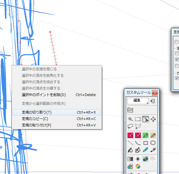 間違えて「下書き」レイヤーにおいてしまう事があります。よくやります。僕は。 ところがパース定規を「風景」レイヤーにコピペするやり方がよく分かりません… かなり強引なやり方ですが僕はこうしてます。 パース定規を置いてしまったレイヤーに 適当に「直線定規」を引いてください。 「定規を作成」アイコンにチェックが入ってるのを 確認してください。(ウインドウ、アイコンの真ん中) 次に、パース定規とさっき引いた直線定規を 「定規選択」ツールでまとめて選択してください。 ぐぐっとアップして さっきの直線定規を右クリックすると、 下3つの「定規の切り取り」が選択できるようになるので チェックすると、丸ごと定規が消えてなくなりますので、 風景レイヤーを選択し、そのまま画面を右クリック、 定規の貼り付け」をチェックすれば、パース定規がコピペされます。 PR |